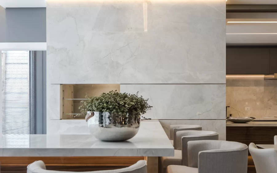 O mármore Monte Cristo PR, com tons suaves de cinza sobre fundo branco, é ideal para ambientes residenciais e comerciais, como bancadas gourmet, banheiros e escadas luxuosas, harmonizando com a decoração. Disponível em diversas dimensões e acabamentos.